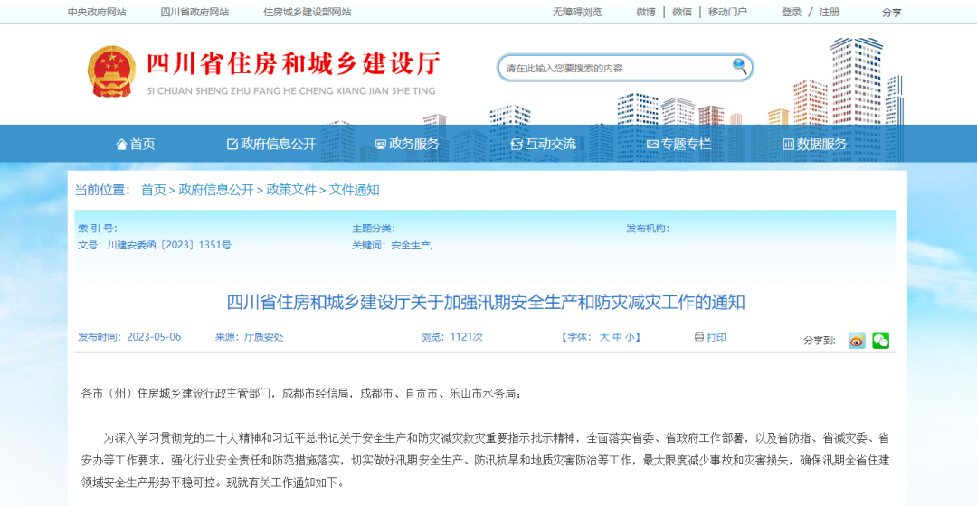 2023年5月6日,四川省住房和城乡建设厅发布《关于加强汛期安全生产和防灾减灾工作的通知》。