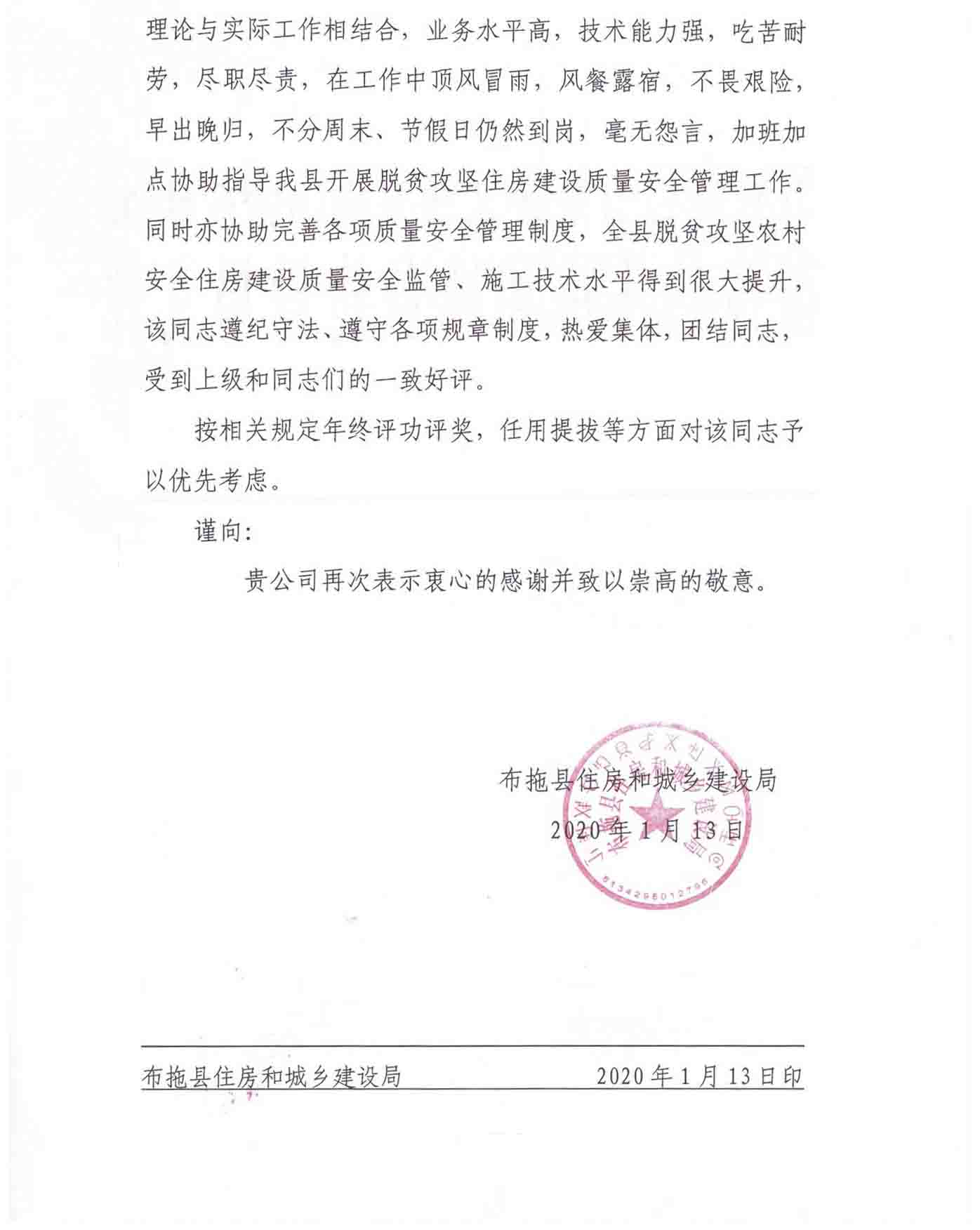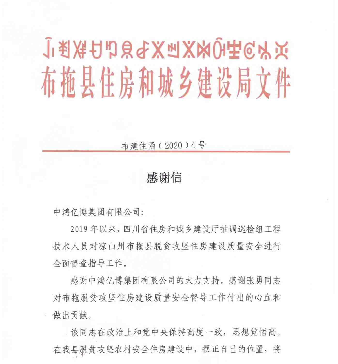 在2019年度扶贫攻坚工作中,集团员工张勇总监全程全年配合工作,在安全督导工作中吃苦耐劳,思想觉悟高,不畏艰险,早出晚归,没有节假日,没有周末,加班加点协助指导开展脱贫攻坚住房建设质量安全管理制度,安全住房建设质量安全监管。此次工作中张勇同志得到了布拖县住房和城乡建设局的高度评价,还为集团发来了感谢信。