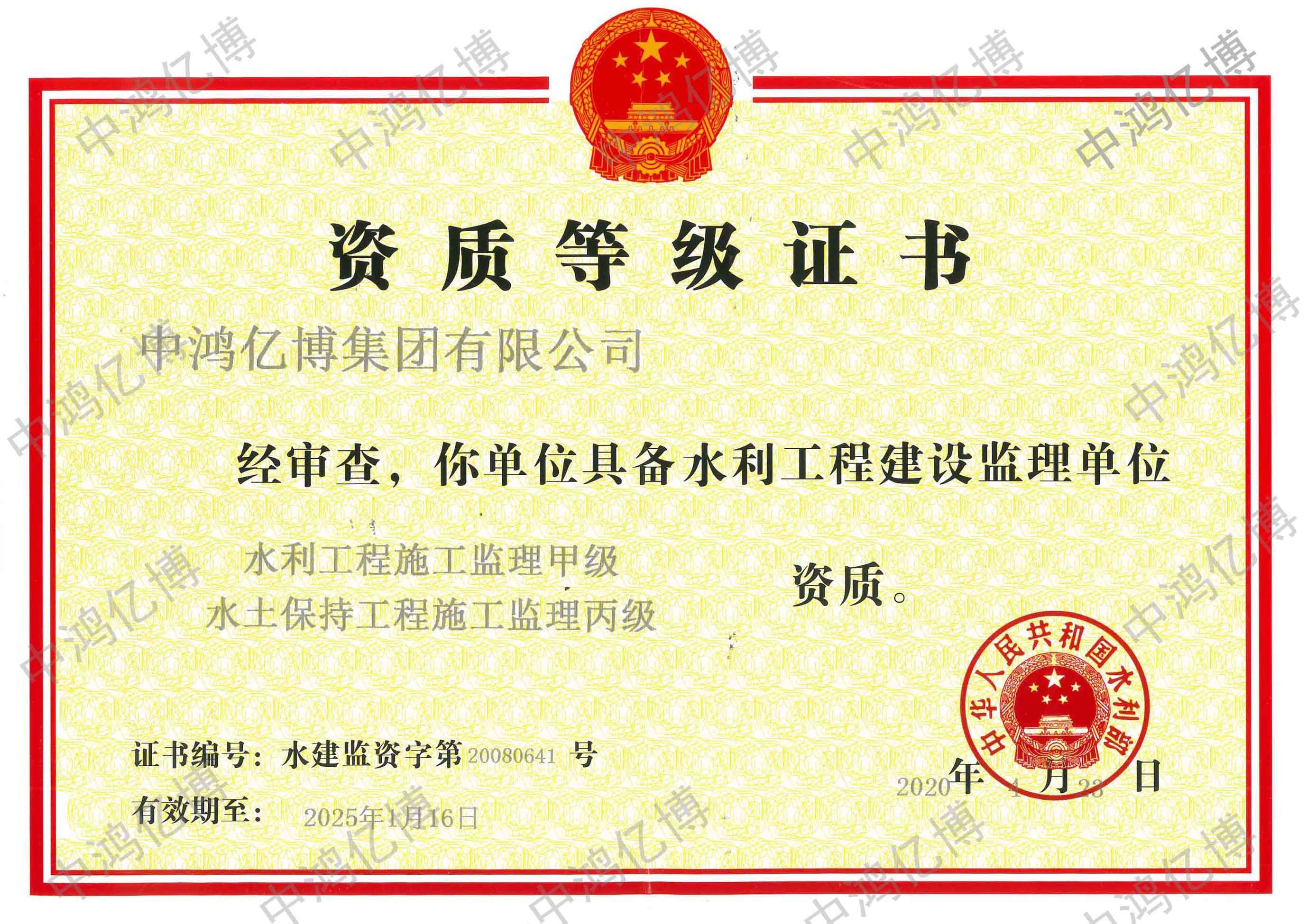 中鸿亿博集团在集团董事会的正确领导下、在全体员工的共同努力下、在社会各界朋友的关心与支持下,集团终于守得云开见月明,成功取得水利部颁发的水利工程施工监理甲级、水土保持工程施工监理丙级资质;这是亿博集团发展史上的又一个重要的里程碑事件,给集团未来的长足发展带来了巨大的生存和发展空间,亿博集团全体员工一定会不负众望和社会各界朋友一起凝心聚力,一如既往地为我们的客户提供高水平、高质量、最优质的监理服务工作,在水利工程施工监理业务方面大放异彩,为集团公司的未来发展再谱新篇。