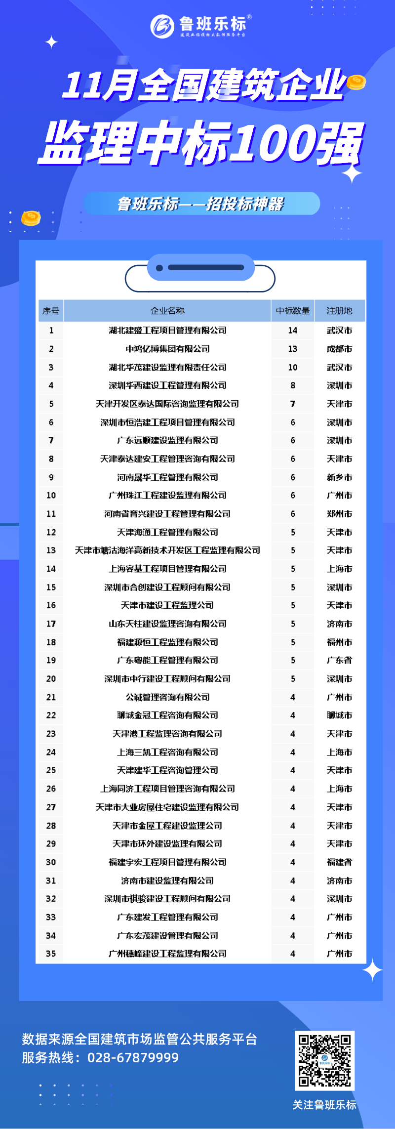湖北建盛工程项目管理有限公司以中标14个居榜首;