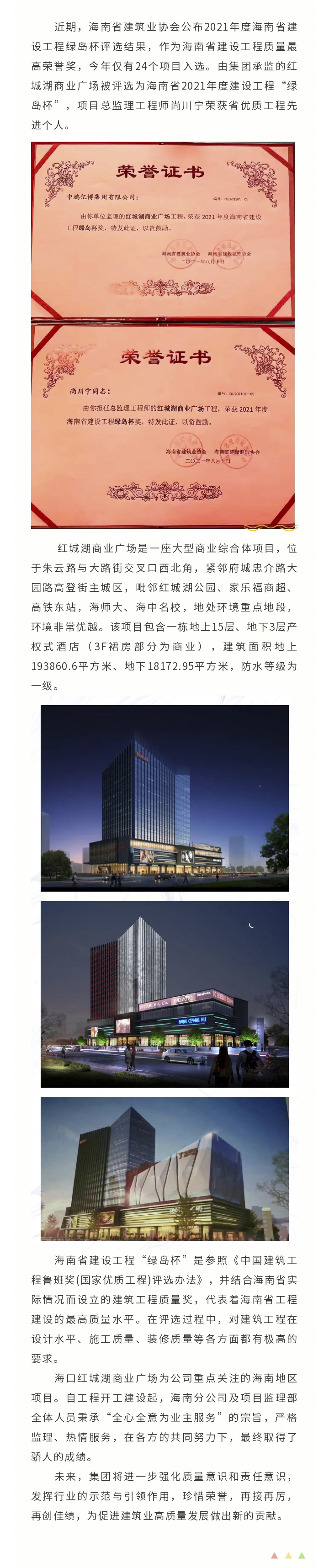 【再添一省奖 】集团监理红城湖商业广场项目获评“绿岛杯”
