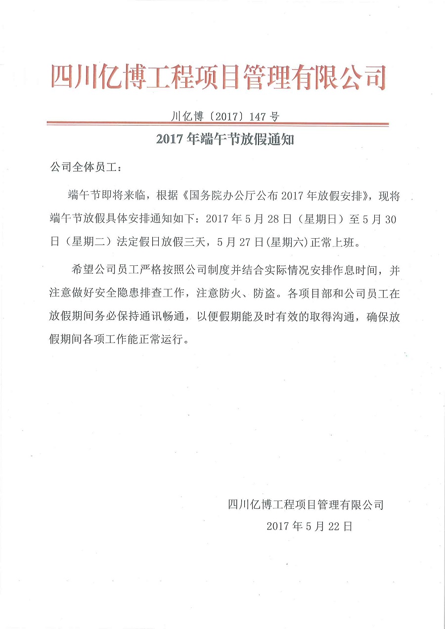 2017年端午节放假通知