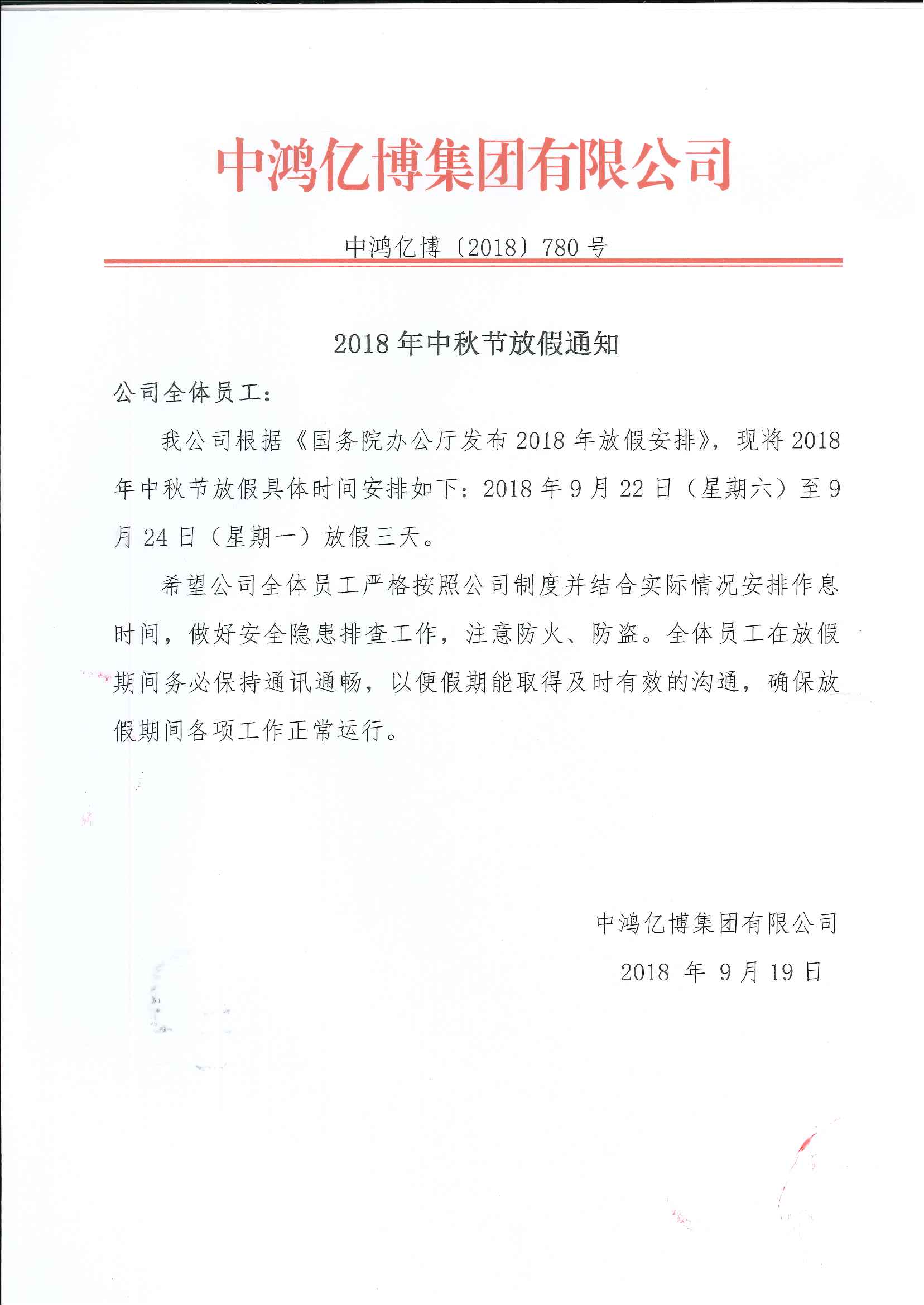 2018年中秋节放假通知