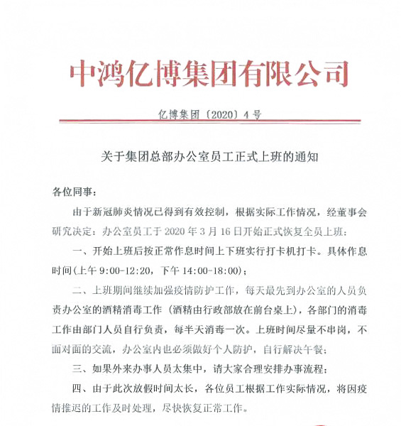 中鸿亿博集团关于集团总部办公室员工正式上班的通知