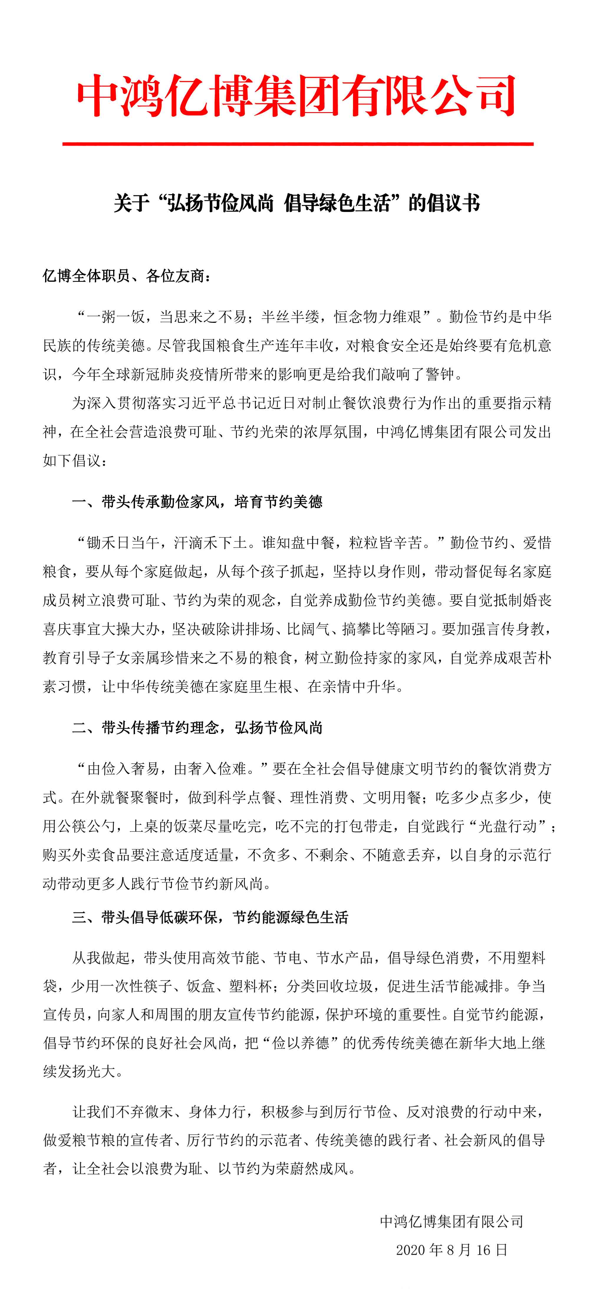 关于“弘扬节俭风尚 倡导绿色生活”的倡议书
