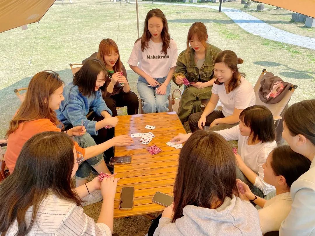 下午时分,为了让员工劳逸结合放松心情,公司提供了多个休闲场地自行选择。一部分女神们围坐在草坪上玩起了棋牌,也有一部分女神在景区骑车观景,“川麻”自然也未落下。