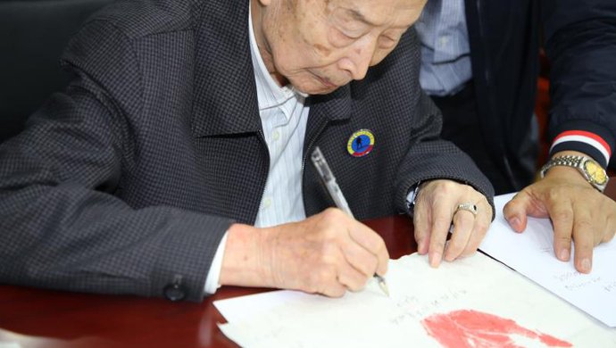 这100名抗战老兵的手印,是从600余份参加过抗日战争的老兵手印中精选出来的,其中包括参加过淞沪会战的抗战老兵及蒋介石专机驾驶员等。曾经担任过蒋介石警卫连长的94岁抗战老兵郭文侠先生也专程从四川来到上海参加捐赠活动,共同铭记抗战历史,并现场采集制作了其本人的红手印。